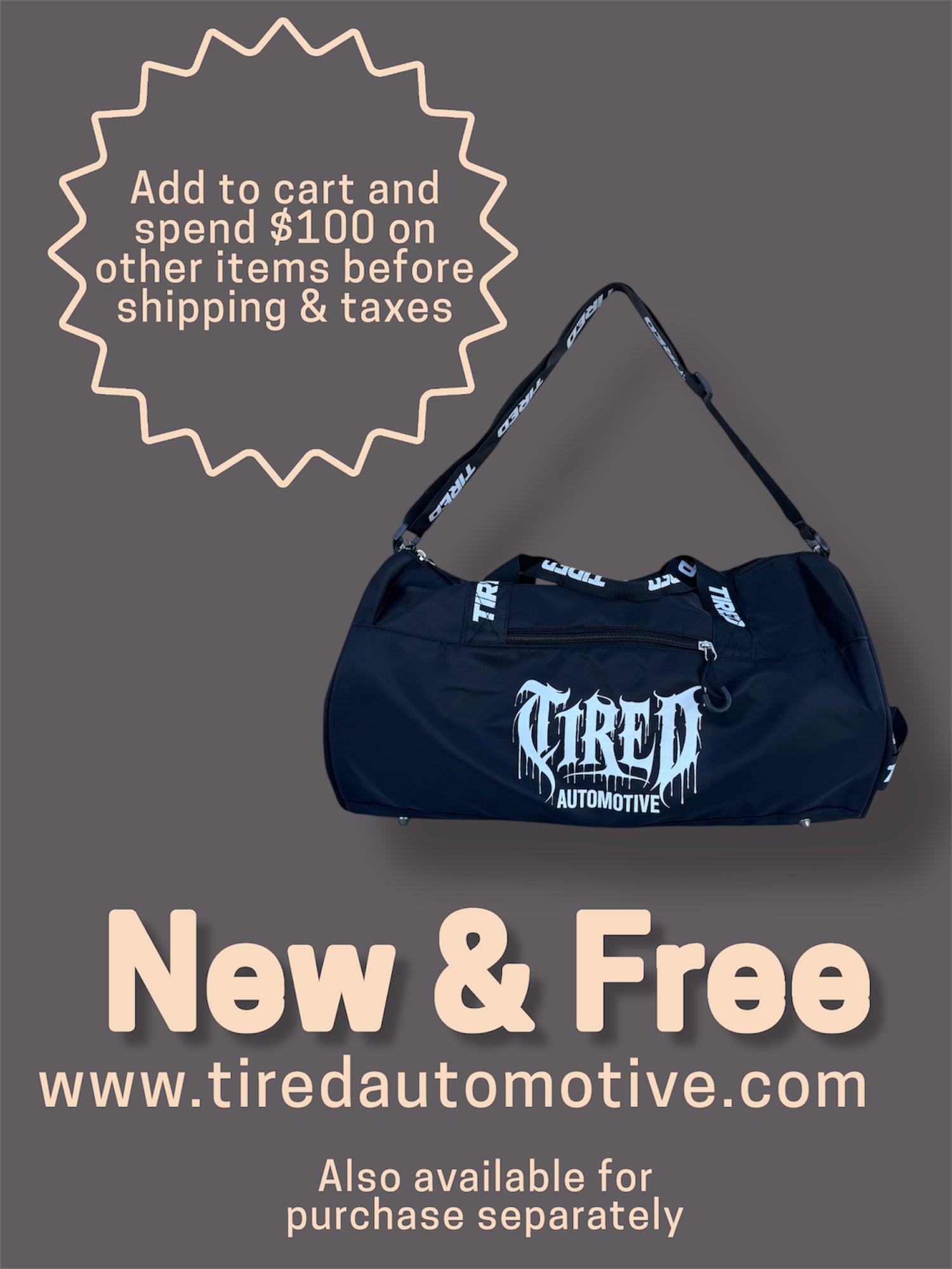 The new limited edition Tired Duffel is available for FREE when you spend $100* on anything else at tiredautomotive.com ! Just add it to your cart and the discount will automatically happen at checkout! What to just purchase separately? No problem! They are available while quantities last!